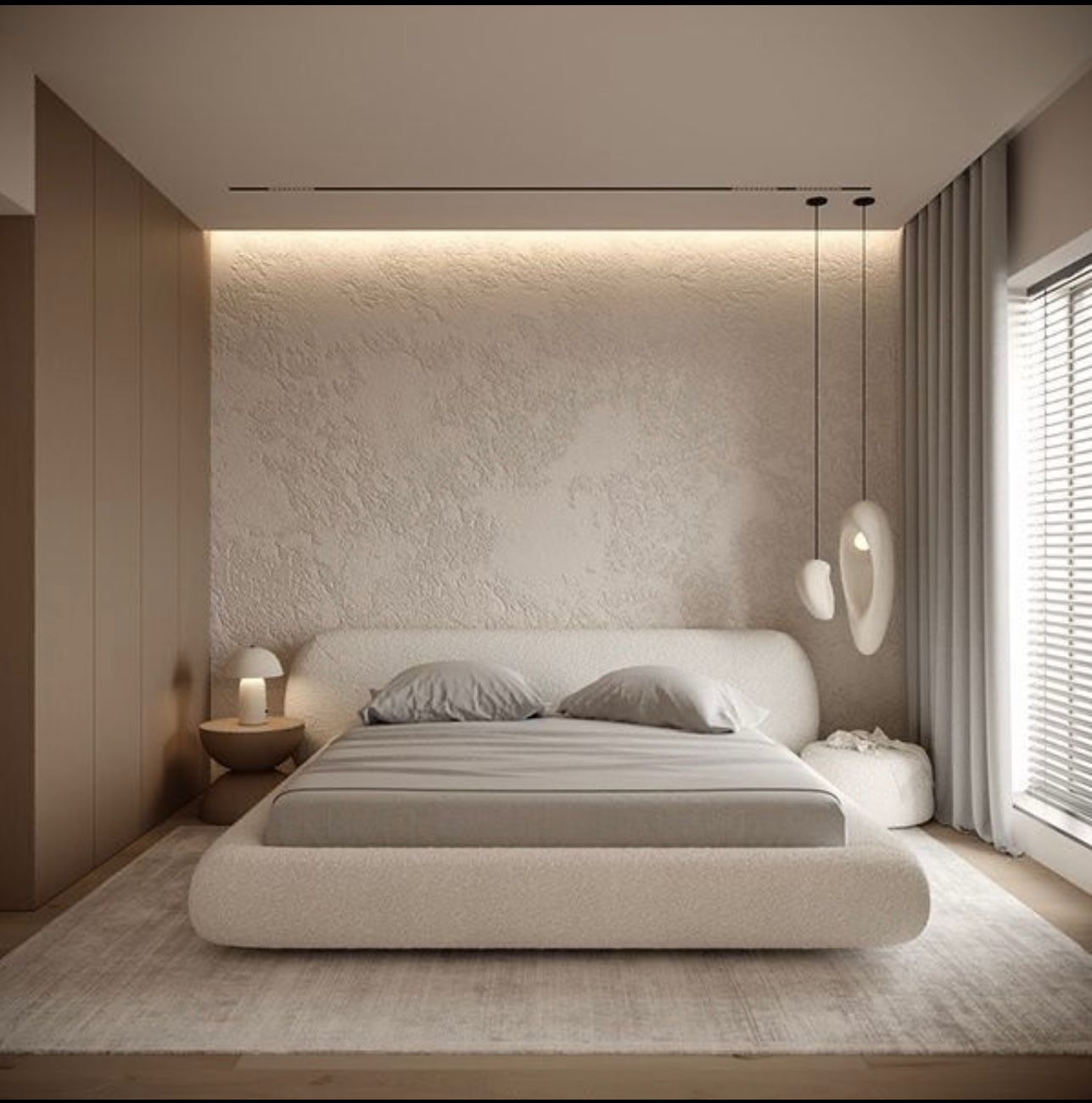 Ontworpen voor wie rust en verfijning zoekt, combineren de bedden organische vormen met een serene uitstraling. De zachte, afgeronde lijnen en de bekleding in Bouclé geven de slaapkamer een gevoel van luxe eenvoud.